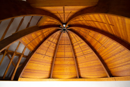 A ravatalozó tere átmeneti tér, a földi és az örök élet "kapuja". Ez a szimbolika jelenik meg a kör alaprajzú ravatalozó tetőzetének kettős kialakításában. A nyugati oldalon a teret kupola zárja le, a keleti oldalon viszont nyitott a tér a magasabb nyeregtető szerkezete alatt. A nyeregtetős teret, a keleti oldalról, a harangtoronyba ékelt kereszt-fényablak világítja be. Ezen ablaktérnek az alakzatát mintha a kereszten átáramló fény-nyalábok csiszolták, formálták volna. Krisztus az út, igazság, élet, ő az örök élet kapuja. Így a kereszt-fényablak Krisztus szimbóluma, mert ő az átjáró tér a halál küszöbét átlépő léleknek, másrészt ő a remény és vigaszt hozó világosság a gyászolóknak. A ravatalozó tér körfalát a keleti oldalon egy külső köríves fal öleli, amely részben a kápolna külső fala és részben kerítésfal. Az utcák felé elhelyezett íves kerítésfal hang és vizuális védelmet biztosít, és a székely kerített vártemplomainkat idézi. Íves vonalvezetését követi a kápolna keleti homlokzata és haragtornya.